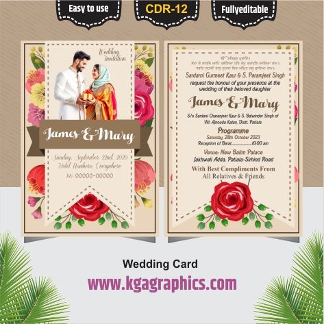 ਇਹ ਫਾਇਲ ਤੁਹਾਨੂੰ ਕੋਰਲ ਡਰਾਅ ਦੇ ਵਰਜ਼ਨ 12 ਵਿੱਚ ਮਿਲੇਗੀ ਪਰ ਤੁਸੀਂ ਇਸ ਫਾਇਲ ਨੂੰ 12 ਤੋਂ ਉਪਰ ਕਿਸੇ ਵੀ ਵਰਜ਼ਨ ਵਿੱਚ ਖੋਲ ਸਕਦੇ ਹੋ। ਇਸ ਫਾਇਲ ਵਿੱਚ ਵਰਤੇ ਗਏ ਸਾਰੇ ਫੋਂਟ ਫਾਇਲ ਦੇ ਨਾਲ ਦਿੱਤੇ ਗਏ ਹਨ । ਇਹ ਫਾਇਲ ਪੂਰੀ ਤਰ੍ਹਾਂ ਅਡਿਟਏਬਲ ਹੈ ਤੁਸੀ ਫੋਂਟ, ਫੋਟੋ, ਟੈਕਸ, ਵਿਕਟਰ ਆਦਿ ਸਭ ਕੁੱਝ ਬਦਲ ਸਕਦੇ ਹੋ। ਜੇਕਰ ਤੁਸੀਂ ਬੈਕਗਰਾਊਂਡ ਦਾ ਰੰਗ ਬਦਲਣਾਂ ਚਹੁੰਦੇ ਹੋ ਉਹ ਵੀ ਬਦਲ ਸਕਦੇ ਹੋ। Digital Best New Wedding Card Design ਫਾਇਲ ਤੁਸੀ ਕਿਸੇ ਲਈ ਵੀ ਵਰਤ ਸਕਦੇ ਹੋ, ਤੁਸੀਂ ਅਪਣੇ ਮੁਤਾਬਕ ਇਸਨੂੰ ਪੰਜਾਬੀ, ਹਿੰਦੀ, ਅੰਗਰੇਜ਼ੀ, ਮਰਾਠੀ, ਉਰਦੂ ਆਦਿ ਕਿਸੇ ਵੀ ਭਾਸ਼ਾ ਵਿੱਚ ਅਡਿਟ ਕਰ ਸਕਦੇ ਹੋ। ਫਇਲ ਨੂੰ ਡਾਊਨਲੋਡ ਕਰਨ ਲਈ ਦਿੱਤੇ ਸਟੈਪਾ ਨੂੰ ਫੋਲੋ ਕਰੋ।