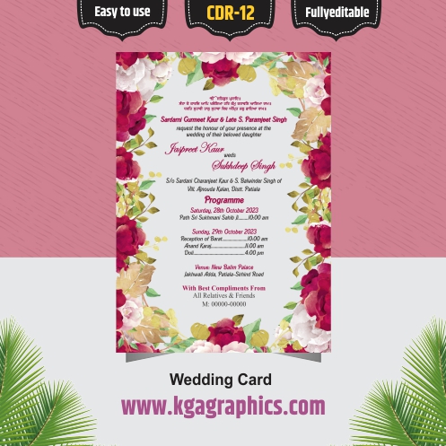 ਇਹ ਫਾਇਲ ਤੁਹਾਨੂੰ ਕੋਰਲ ਡਰਾਅ ਦੇ ਵਰਜ਼ਨ 12 ਵਿੱਚ ਮਿਲੇਗੀ ਪਰ ਤੁਸੀਂ ਇਸ ਫਾਇਲ ਨੂੰ 12 ਤੋਂ ਉਪਰ ਕਿਸੇ ਵੀ ਵਰਜ਼ਨ ਵਿੱਚ ਖੋਲ ਸਕਦੇ ਹੋ। ਇਸ ਫਾਇਲ ਵਿੱਚ ਵਰਤੇ ਗਏ ਸਾਰੇ ਫੋਂਟ ਫਾਇਲ ਦੇ ਨਾਲ ਦਿੱਤੇ ਗਏ ਹਨ । ਇਹ ਫਾਇਲ ਪੂਰੀ ਤਰ੍ਹਾਂ ਅਡਿਟਏਬਲ ਹੈ ਤੁਸੀ ਫੋਂਟ, ਫੋਟੋ, ਟੈਕਸ, ਵਿਕਟਰ ਆਦਿ ਸਭ ਕੁੱਝ ਬਦਲ ਸਕਦੇ ਹੋ। ਜੇਕਰ ਤੁਸੀਂ ਬੈਕਗਰਾਊਂਡ ਦਾ ਰੰਗ ਬਦਲਣਾਂ ਚਹੁੰਦੇ ਹੋ ਉਹ ਵੀ ਬਦਲ ਸਕਦੇ ਹੋ। Digital Fancy Wedding Card Design ਫਾਇਲ ਤੁਸੀ ਕਿਸੇ ਲਈ ਵੀ ਵਰਤ ਸਕਦੇ ਹੋ, ਤੁਸੀਂ ਅਪਣੇ ਮੁਤਾਬਕ ਇਸਨੂੰ ਪੰਜਾਬੀ, ਹਿੰਦੀ, ਅੰਗਰੇਜ਼ੀ, ਮਰਾਠੀ, ਉਰਦੂ ਆਦਿ ਕਿਸੇ ਵੀ ਭਾਸ਼ਾ ਵਿੱਚ ਅਡਿਟ ਕਰ ਸਕਦੇ ਹੋ। ਫਇਲ ਨੂੰ ਡਾਊਨਲੋਡ ਕਰਨ ਲਈ ਦਿੱਤੇ ਸਟੈਪਾ ਨੂੰ ਫੋਲੋ ਕਰੋ।