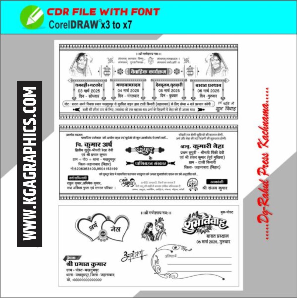 ਇਹ ਫਾਇਲ ਤੁਹਾਨੂੰ ਕੋਰਲ ਡਰਾਅ ਦੇ ਵਰਜ਼ਨ 12 ਵਿੱਚ ਮਿਲੇਗੀ ਪਰ ਤੁਸੀਂ ਇਸ ਫਾਇਲ ਨੂੰ 12 ਤੋਂ ਉਪਰ ਕਿਸੇ ਵੀ ਵਰਜ਼ਨ ਵਿੱਚ ਖੋਲ ਸਕਦੇ ਹੋ। ਇਸ ਫਾਇਲ ਵਿੱਚ ਵਰਤੇ ਗਏ ਸਾਰੇ ਫੋਂਟ ਫਾਇਲ ਦੇ ਨਾਲ ਦਿੱਤੇ ਗਏ ਹਨ । ਇਹ ਫਾਇਲ ਪੂਰੀ ਤਰ੍ਹਾਂ ਅਡਿਟਏਬਲ ਹੈ ਤੁਸੀ ਫੋਂਟ, ਫੋਟੋ, ਟੈਕਸ, ਵਿਕਟਰ ਆਦਿ ਸਭ ਕੁੱਝ ਬਦਲ ਸਕਦੇ ਹੋ। ਜੇਕਰ ਤੁਸੀਂ ਬੈਕਗਰਾਊਂਡ ਦਾ ਰੰਗ ਬਦਲਣਾਂ ਚਹੁੰਦੇ ਹੋ ਉਹ ਵੀ ਬਦਲ ਸਕਦੇ ਹੋ। Hindu wedding Card Cover Design 2025 ਫਾਇਲ ਤੁਸੀ ਕਿਸੇ ਲਈ ਵੀ ਵਰਤ ਸਕਦੇ ਹੋ, ਤੁਸੀਂ ਅਪਣੇ ਮੁਤਾਬਕ ਇਸਨੂੰ ਪੰਜਾਬੀ, ਹਿੰਦੀ, ਅੰਗਰੇਜ਼ੀ, ਮਰਾਠੀ, ਉਰਦੂ ਆਦਿ ਕਿਸੇ ਵੀ ਭਾਸ਼ਾ ਵਿੱਚ ਅਡਿਟ ਕਰ ਸਕਦੇ ਹੋ। ਫਇਲ ਨੂੰ ਡਾਊਨਲੋਡ ਕਰਨ ਲਈ ਦਿੱਤੇ ਸਟੈਪਾ ਨੂੰ ਫੋਲੋ ਕਰੋ।