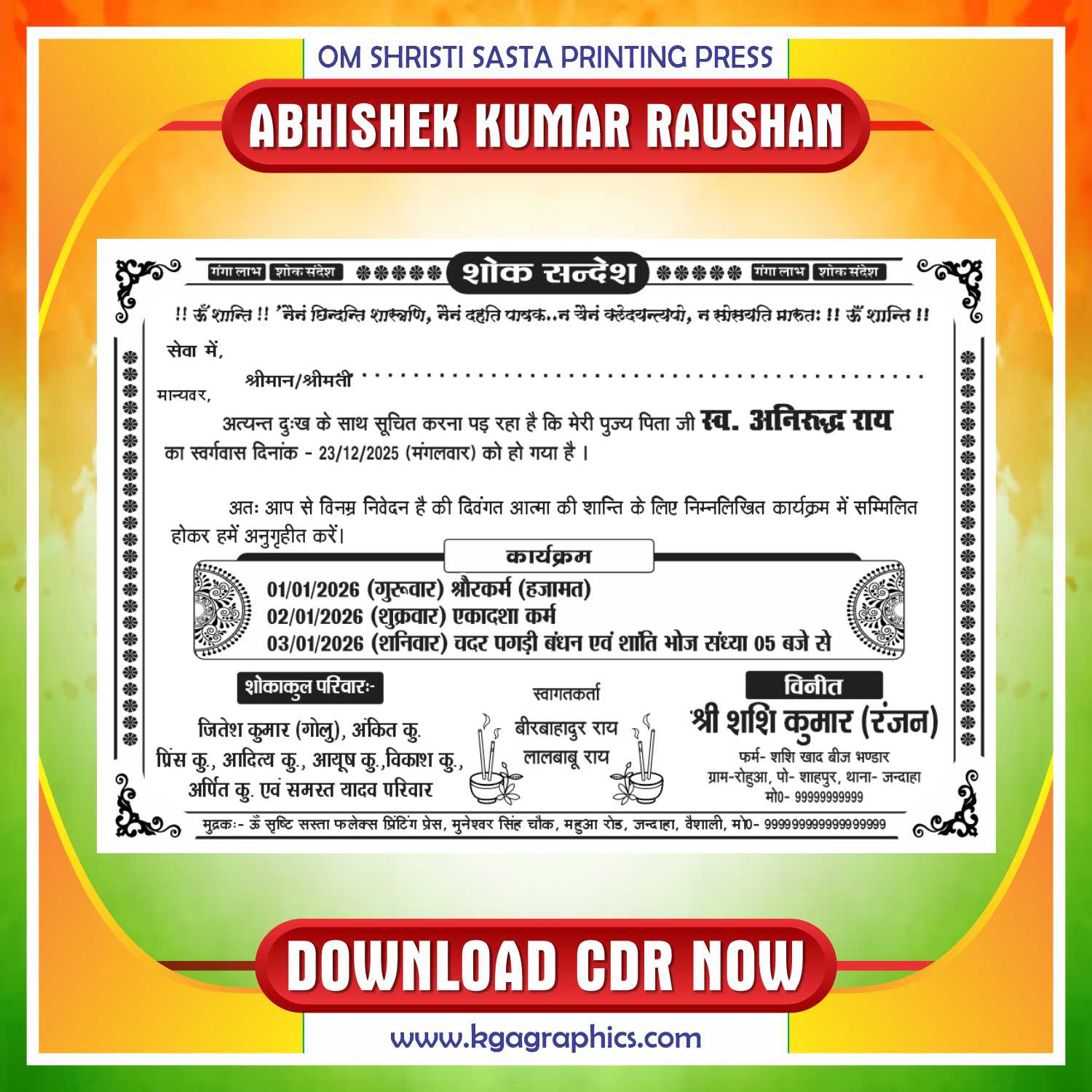 Latest And Best Shok Sandesh / Shrandhanjali Card Design in corel draw file. this file is fully editable.